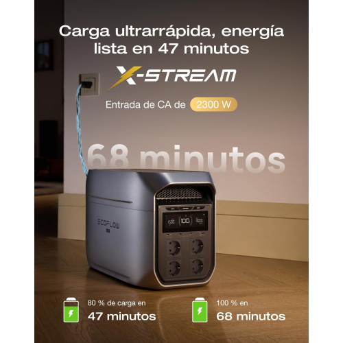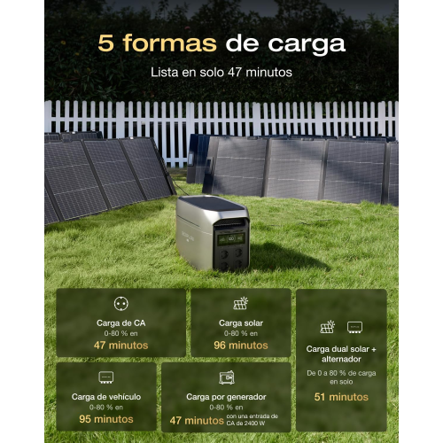 La ECOFLOW Delta 3 Max Plus destaca por su capacidad de carga rápida, alcanzando el 80 % de la batería en solo 47 minutos. Admite múltiples métodos de carga, incluyendo red eléctrica, paneles solares, toma de vehículo, generador y combinaciones híbridas, ofreciendo máxima flexibilidad en cualquier situación.