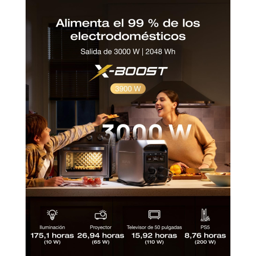 Con una potencia nominal de salida en corriente alterna de 3000 W y picos de hasta 6000 W, la Delta 3 Max Plus puede alimentar hasta el 99 % de los electrodomésticos habituales. La tecnología X-Boost 3.0 permite gestionar cargas de hasta 3900 W, manteniendo una estabilidad eléctrica comparable a la red gracias al control en tiempo real mediante chip DSP.