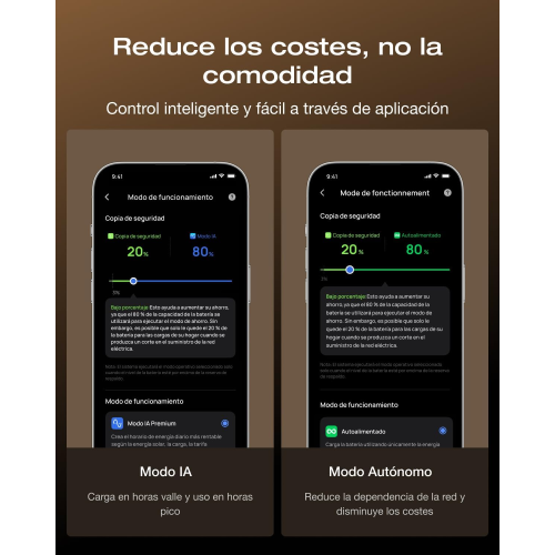 Incorpora función de respaldo SAI con un tiempo de conmutación de tan solo 10 ms, asegurando continuidad eléctrica para equipos sensibles durante cortes de suministro. A través de la aplicación de control, es posible monitorizar en tiempo real el estado de la batería, consumo, temperatura y gestionar modos de funcionamiento de forma intuitiva.